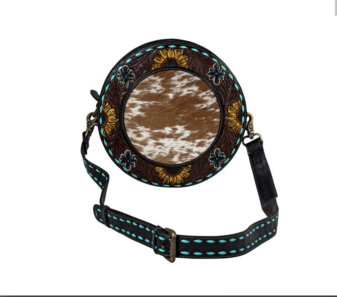 This round bag is amazing, with hair-on hide encircled by beautiful hand-tooled leather with remarkable turquoise stitching. The scene of desert sunflowers and blooms is serene and eye-catching. The back is a striking high-grain leather in deep bourbon chocolate, with a handy zippered pocket. Zipper close top. The adjustable, removable shoulder strap is also detailed in the same turquoise stitching at the front. This beguiling bag will be a sure favorite in your collection!