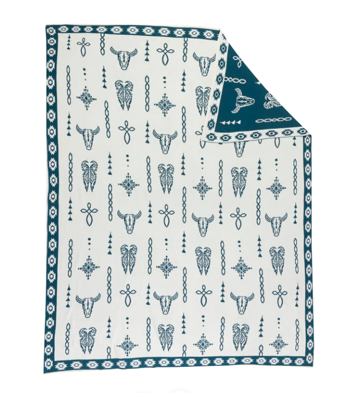 Wrap yourself in mystical Western charm with this deep teal throw featuring delicate white skull and angel wing motifs. The intricate geometric border and spiritual symbols create an enchanting bohemian accent that transforms any space into a desert dreamer's sanctuary.
