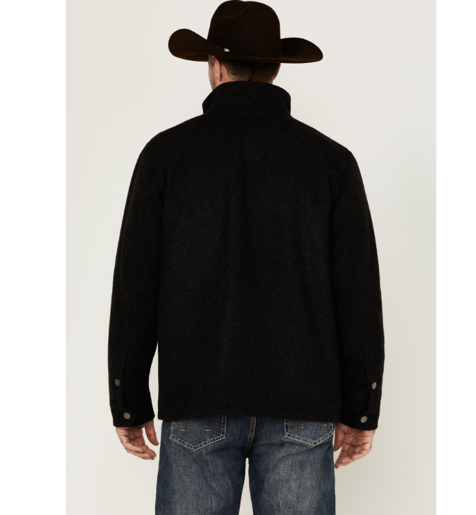 Model is 6'2" wearing a size largeShell: 80% wool / 20% polyester ; Lining: 100% polyesterStand-up collarLong sleevesFull front zip closureTwo single-point flap pockets on chest with snap closuresTwo welt hand warmer pockets with zip closuresHeather black designLinedImported?