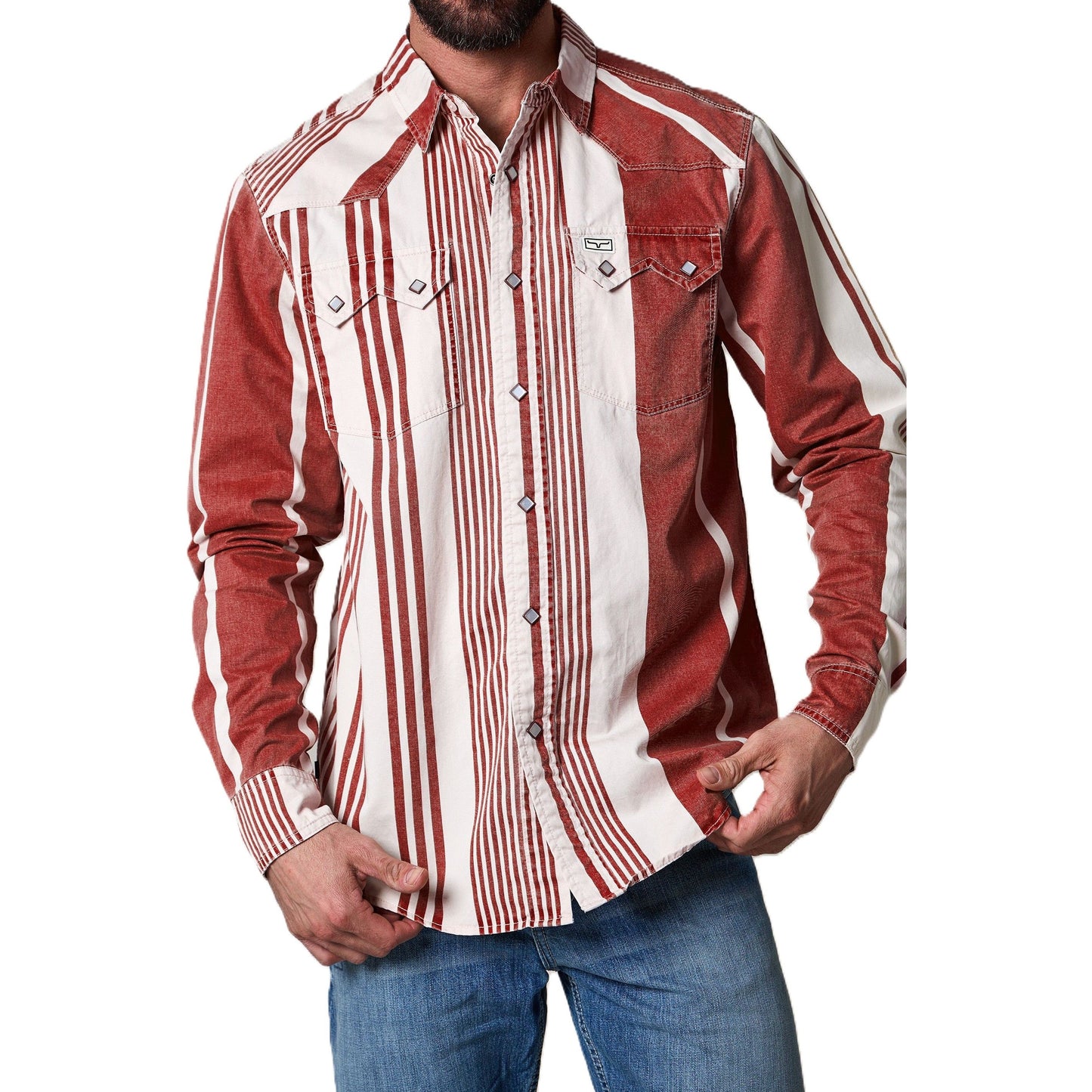 Channel your inner 90s cowboy with the Bandit button down. This vintage-inspired piece captures the essence of rustic charm. Featuring bold popper stripes that evoke a classic western aesthetic, it's a statement shirt that commands attention. A traditional western yoke and iconic twin peaks flap pockets complete the authentic look. Crafted for comfort and durability, this shirt is as tough as it is stylish. The Bandit is a must-have for any modern cowboy.