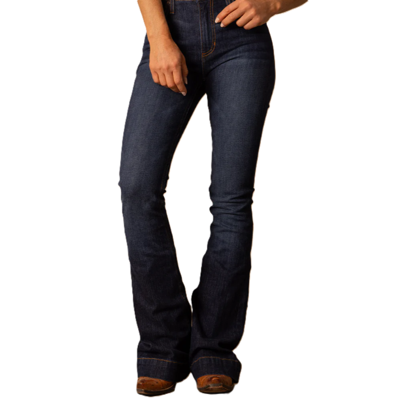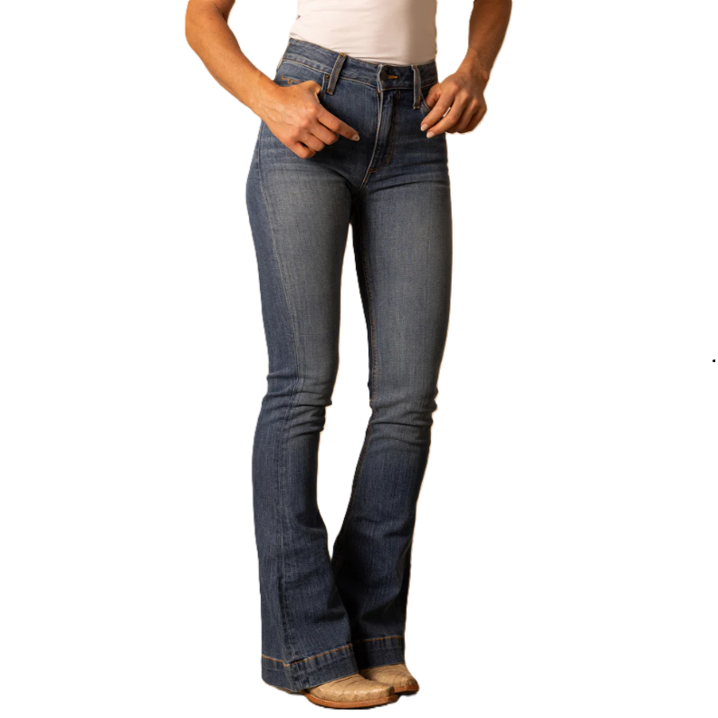 With an ultra-high rise and super wide flare leg, the Jennifer flatters all shapes and sizes. The Jennifer makes a statement in the saddle or the city streets in a dark wash with hand-sanding whisker details Fabric: 99% Cotton | 1% SpandexFit: Ultra High Rise, Fitted Knee, Super Wide Flare Leg with Trouser Hem. Fit Tip: This jean is 99% denim and a higher rise - it has less stretch than other styles. We advise you size down so after a day of wear, your jeans aren't too loose.Details: Hand sanding on dark denim with whisker details