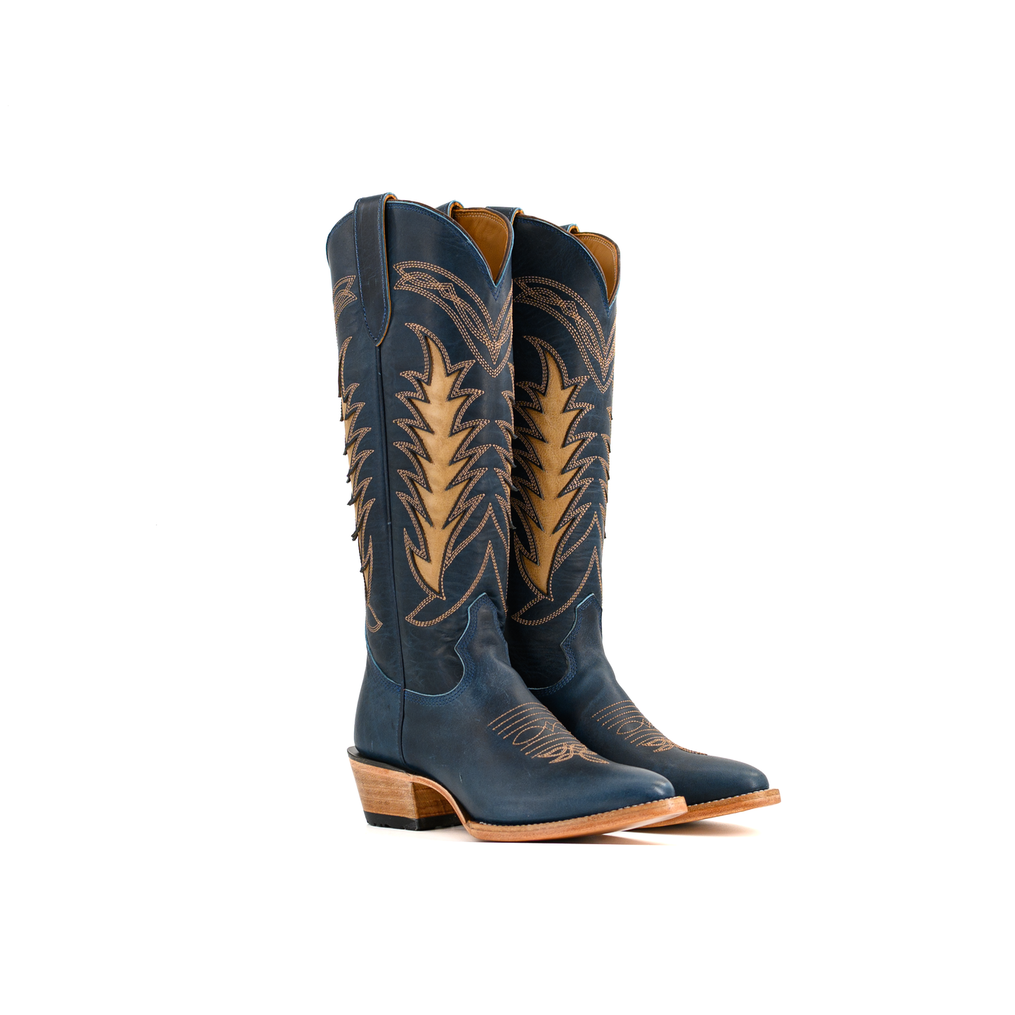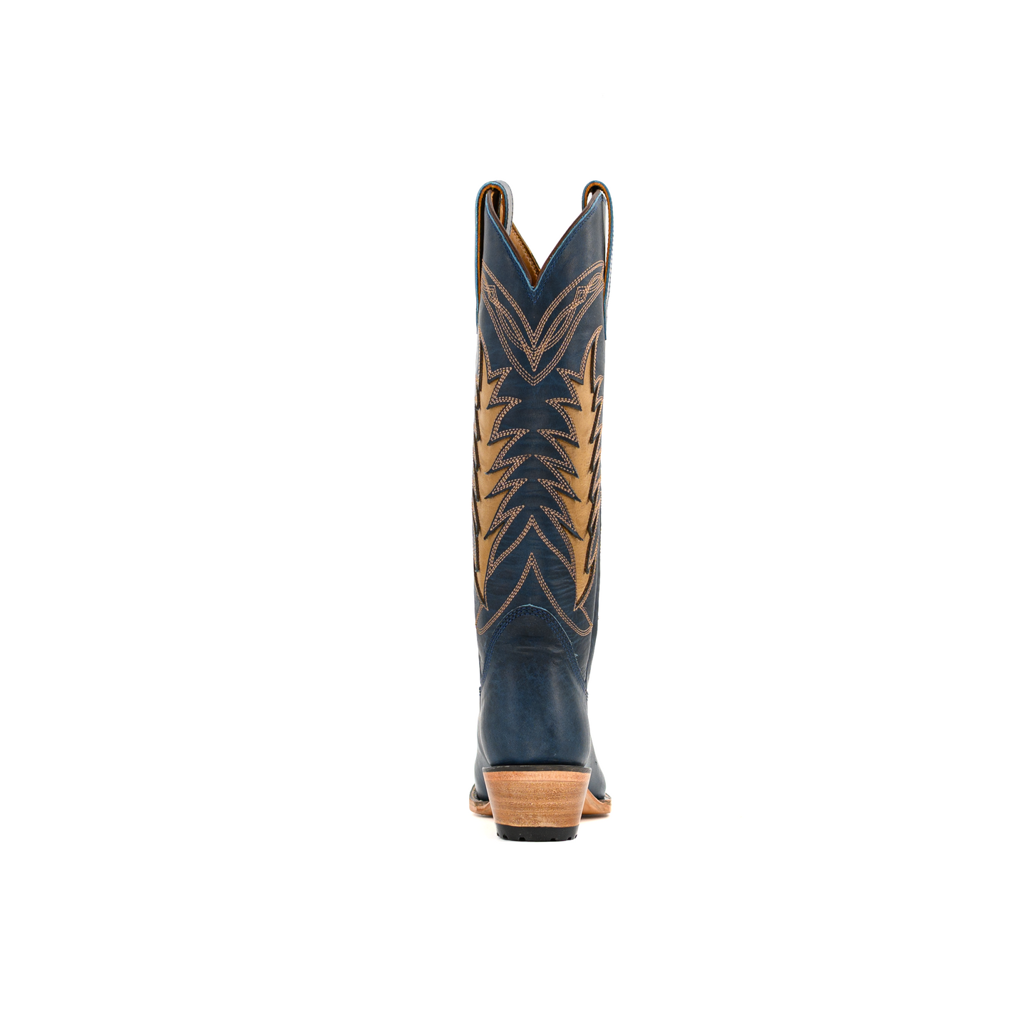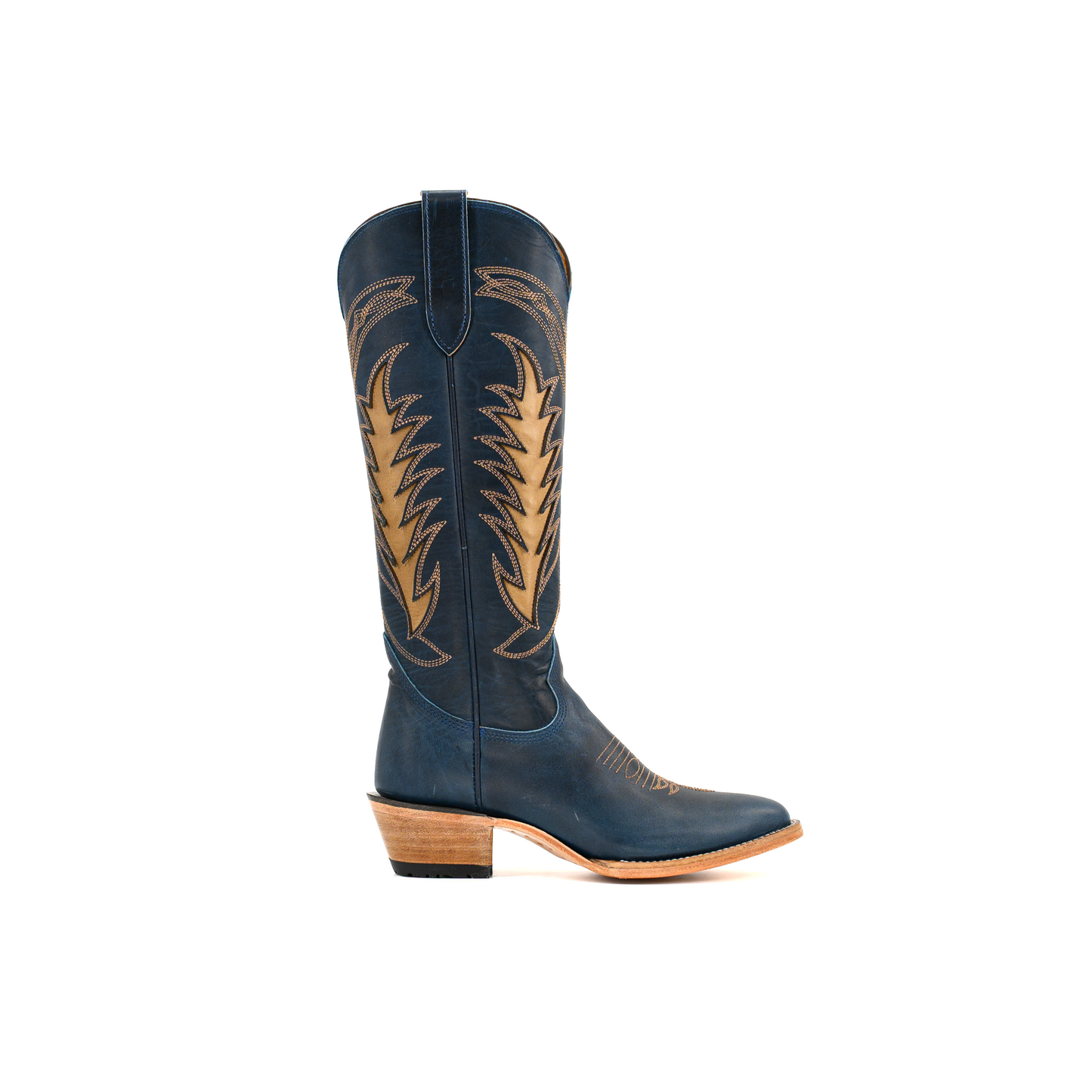 Introducing the Kimberley Boot — an exquisite blend of elegance and Western flair that stands as a true masterpiece. With a commanding 15" shaft, this boot captures attention and admiration. Crafted from striking navy leather, the Kimberley Boot radiates sophistication and individuality. The intricate embroidery, complemented by contrast leather cutouts, adds a touch of artistry, making each step a statement. Alberta Boot's signature toe medallion further enhances the boot's unique identity, reflecting a commitment to quality craftsmanship. Whether you're embracing the spirit of the West or stepping into a refined social setting, the Kimberley Boot effortlessly marries tradition with contemporary style. Elevate your footwear collection with this exceptional piece, where the 15" shaft, navy leather, and distinctive detailing redefine Western fashion.