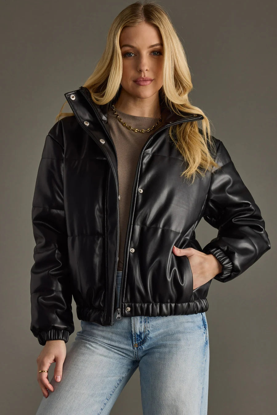 The PANACHE Puffer Jacket combines sleek style with practical warmth. This cropped puffer features a luxe faux leather exterior and dual front pockets for everyday essentials. The hybrid zipper and snap closure offers versatile styling options, while the lightweight polyester construction keeps you comfortable without bulk. Perfect for layering or wearing solo, this jacket delivers modern edge with functional appeal.