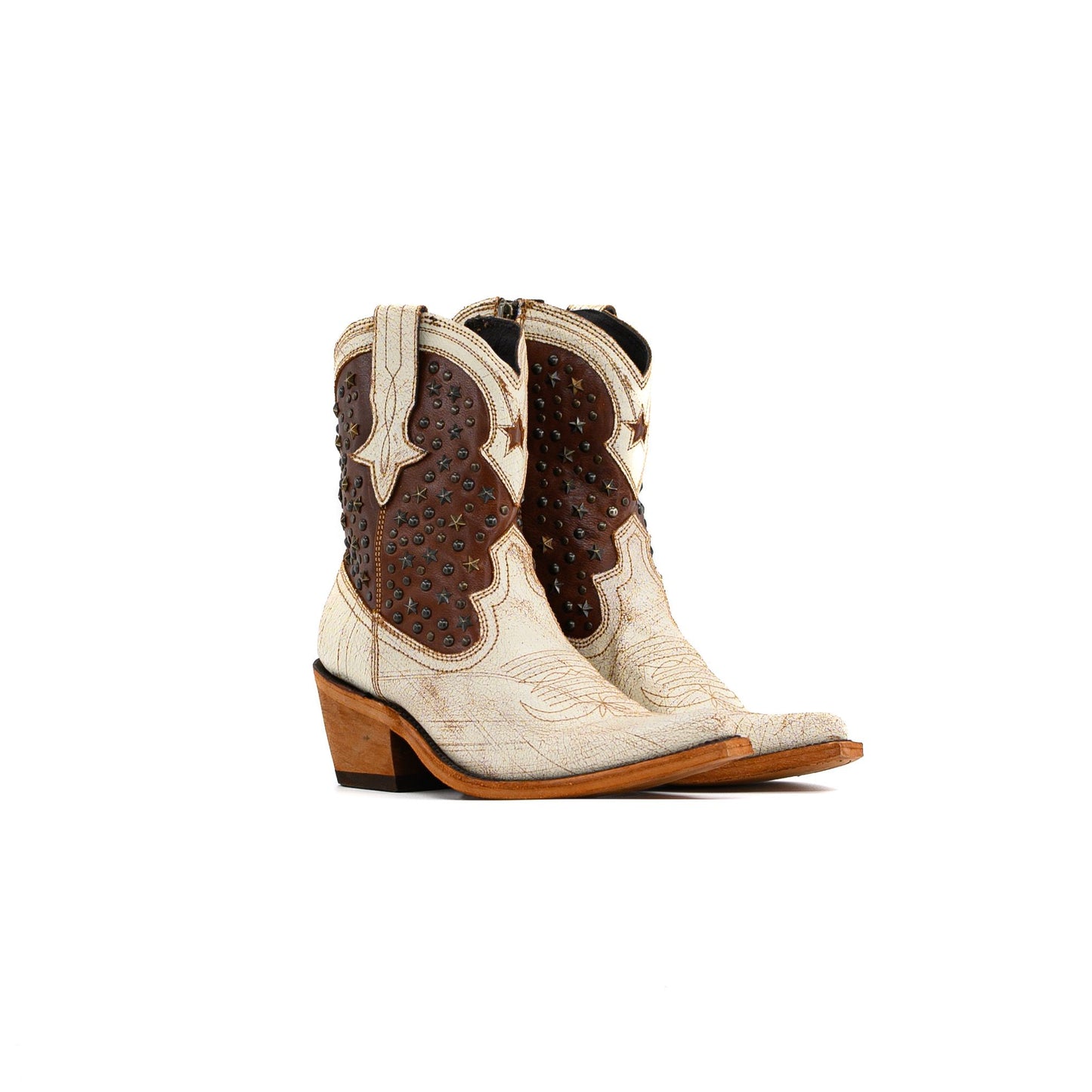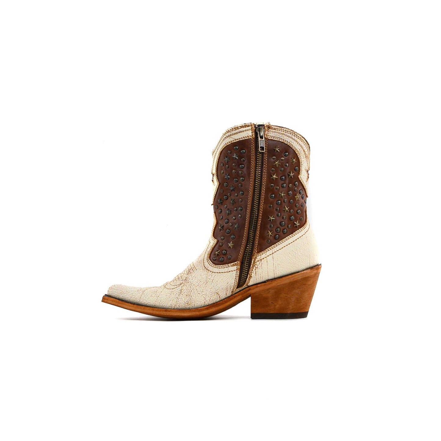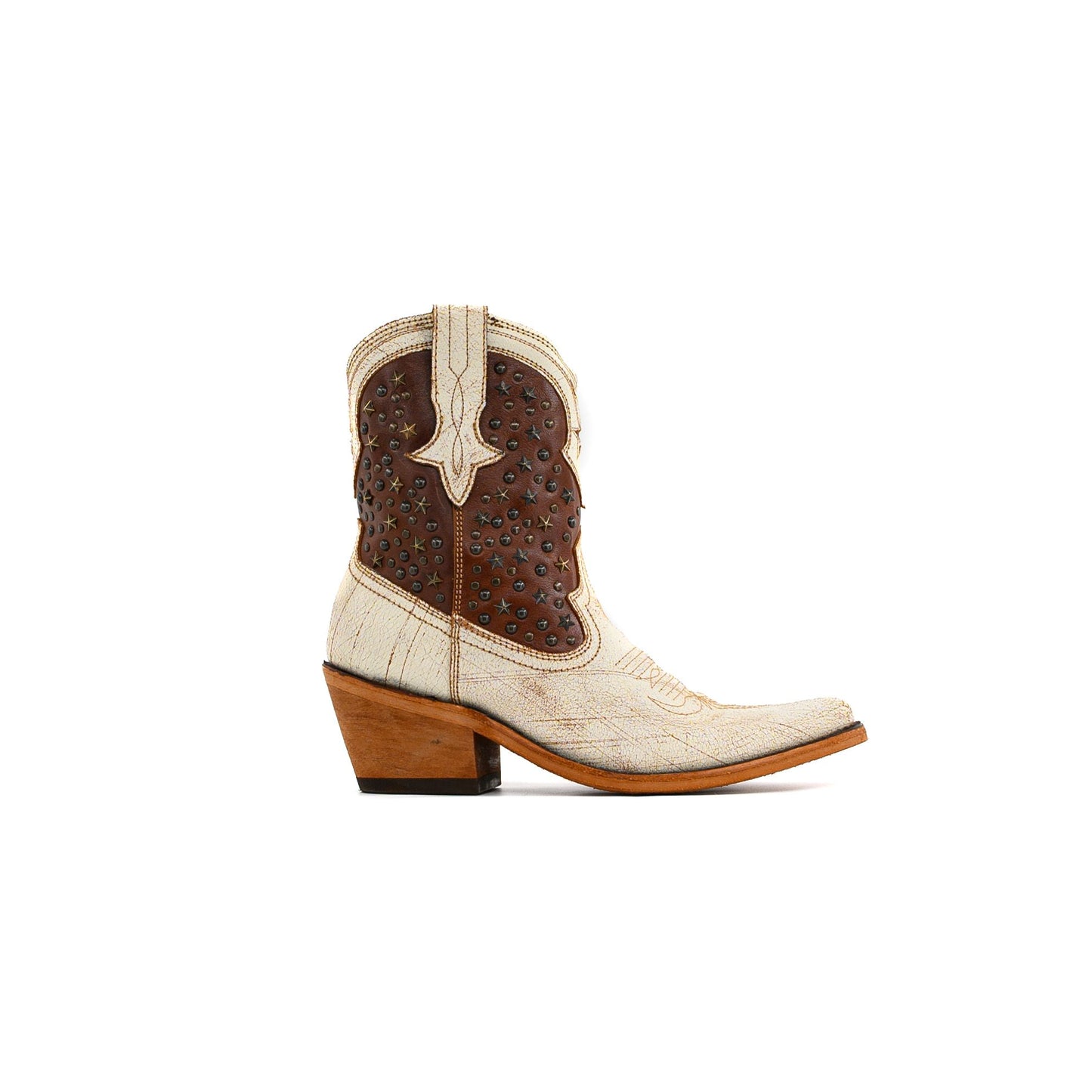 If you want to stand out, meet the Caborca Jules Boot. Chocolate and cream distressed leather, inlay and embellished details, gun metal star studs, because subtle isn’t your style.