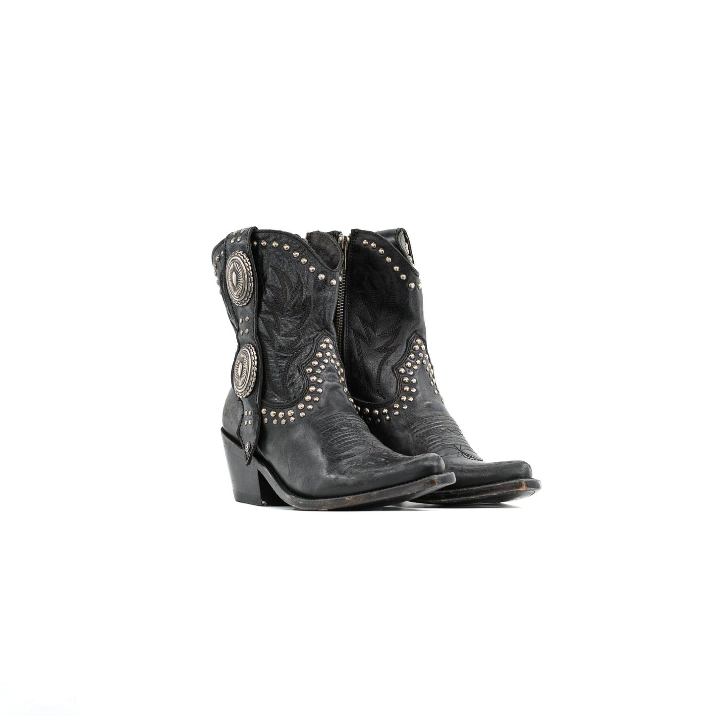 Say hello to your new favourite boots! Perfect with dresses, skirts or jeans, these black genuine leather booties will elevate your look with sophisticated concho and stud detailing.