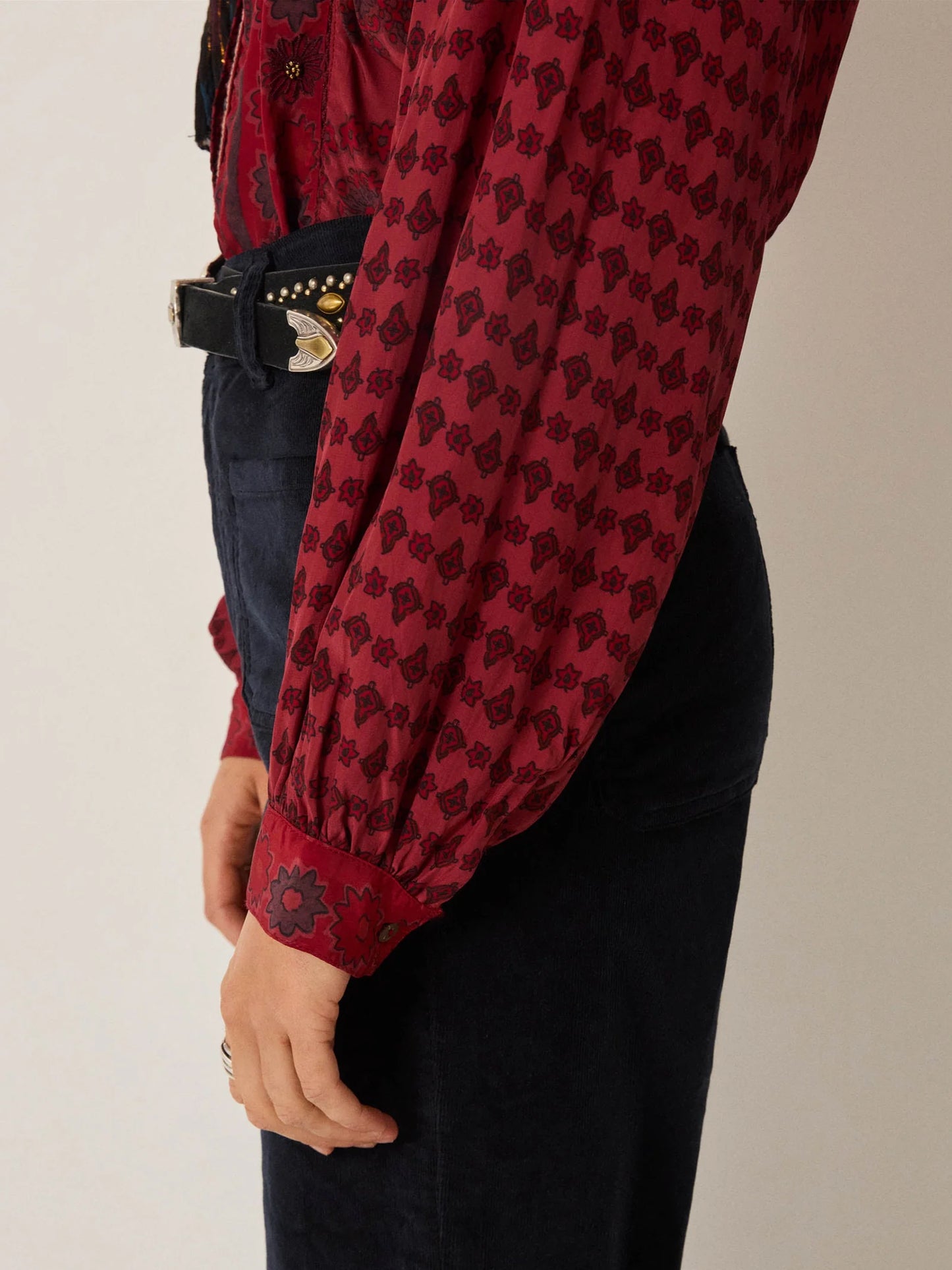 Crafted from luxurious Katrina viscose, this blouse drapes with effortless elegance. The deep Bordeaux hue evokes rich theatre curtains, offering a sophisticated warmth against the skin. The Emilie from Maison Hotel features long sleeves and a classic button-down silhouette, accented with delicate white piping. Its subtle texture creates understated visual interest while the fluid fabric ensures comfortable, all-day wear.