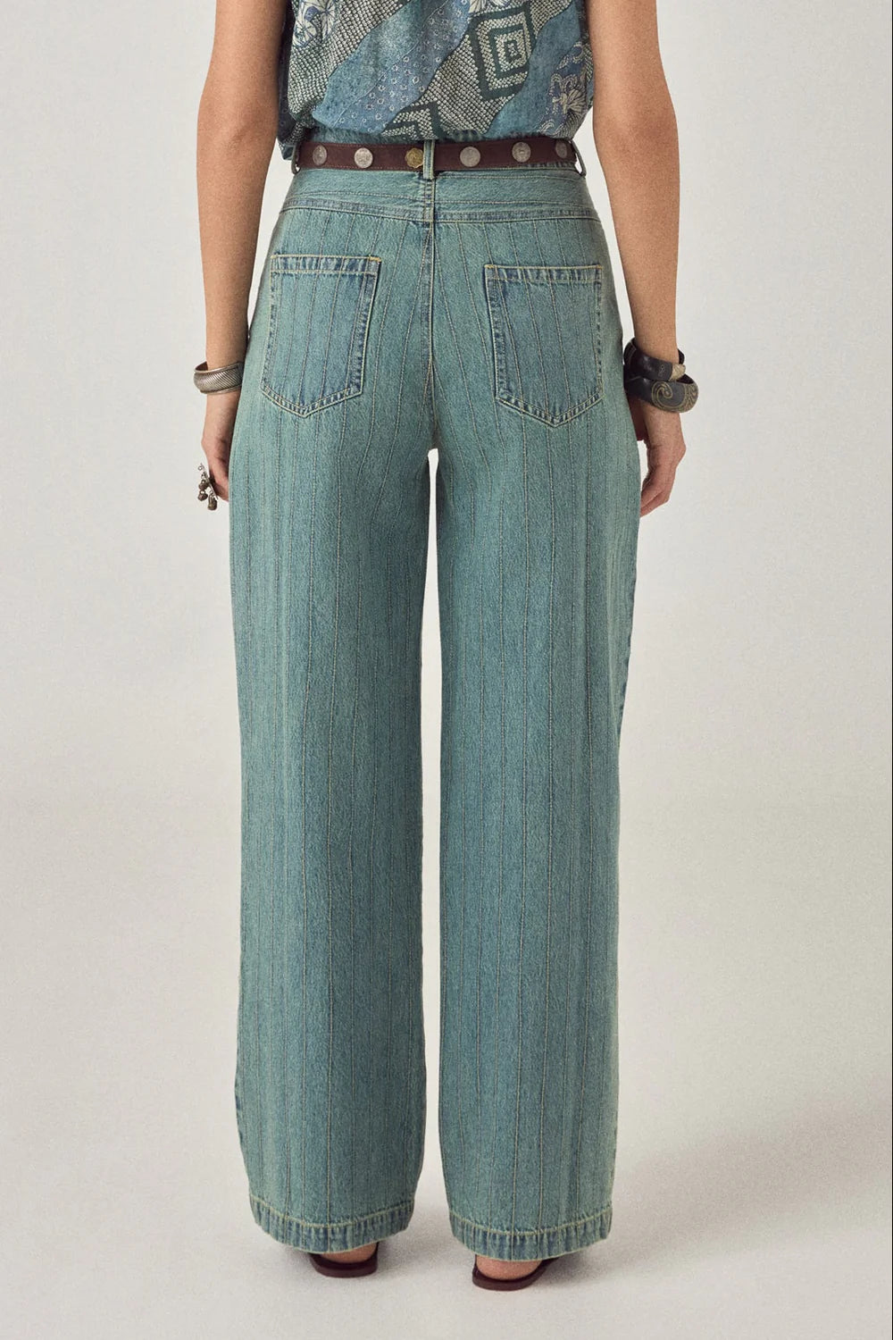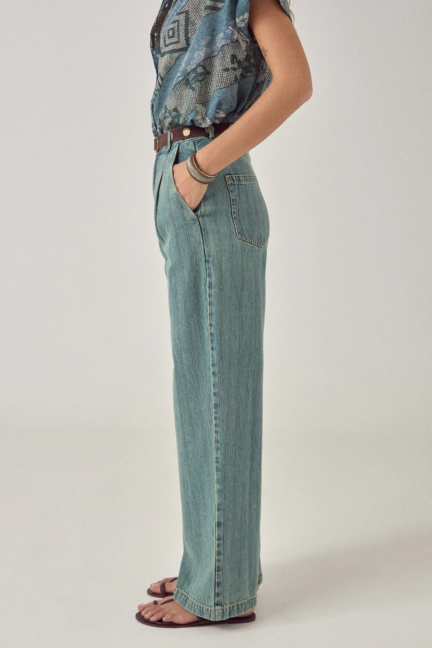 The Maison Hotel Lucky pants commands attention with its bold structure and confident presence. Crafted from premium denim engineered to maintain its shape, these pants feature a deep, richly worn-in blue tone enhanced by crisp vertical stripes that elongate and define the silhouette. The silhouette balances control with generosity—a cinched, defined waist grounds the body while two front pleats create volume through the leg, allowing the fabric to fall straight and wide. The result is a pant that's deliberate and commanding, with architectural precision that translates to effortless style.