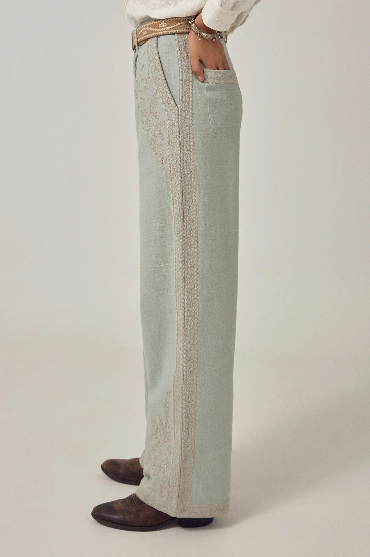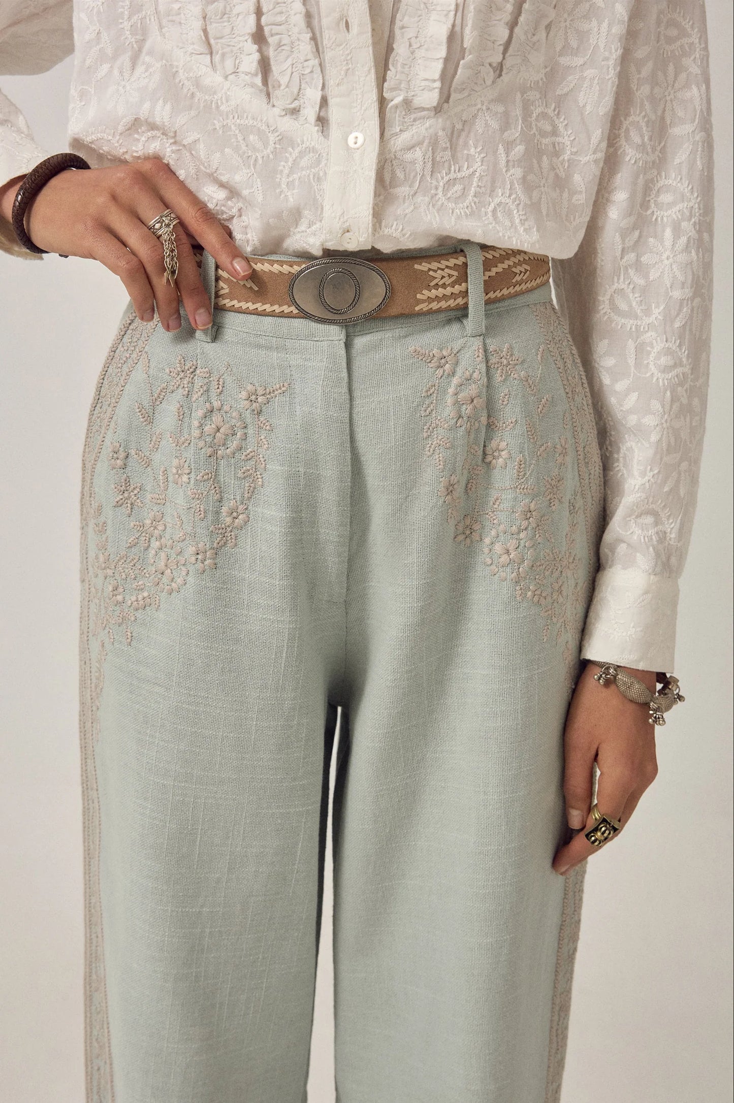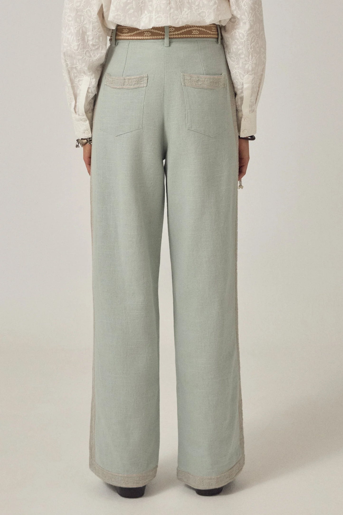 The Maison Hotel Ludovico Pant reinterprets timeless menswear with an emphasis on comfort and refinement. The soft sky-blue fabric drapes with an effortless quality, while delicate grey embroidery traces across the surface—adding visual interest without bulk. The relaxed yet tailored cut sits naturally at the waist and flows straight down the leg, allowing freedom of movement. These trousers prioritize ease over structure, adapting to your body rather than imposing a silhouette.