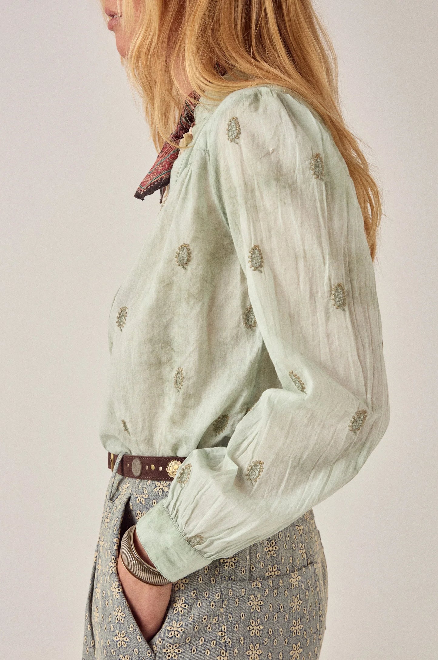 Discover the artistry of hand-dyed craftsmanship with this long-sleeve mineral green shirt from Maison Hotel. Each piece features a unique tie-dye pattern that shifts between translucent and saturated tones, creating a one-of-a-kind aesthetic. Delicate embroidered motifs dance across the surface, anchoring the fluid colour with intentional structure. The loose, reactive base contrasts beautifully with the tight, repeated embroidery detail — a design philosophy that balances raw energy with refined control. Because every shirt is individually hand-dyed, no two are identical. Variations in tone and pattern aren't flaws; they're proof of its handmade origin. A statement piece for those who value individuality and artisanal quality.
