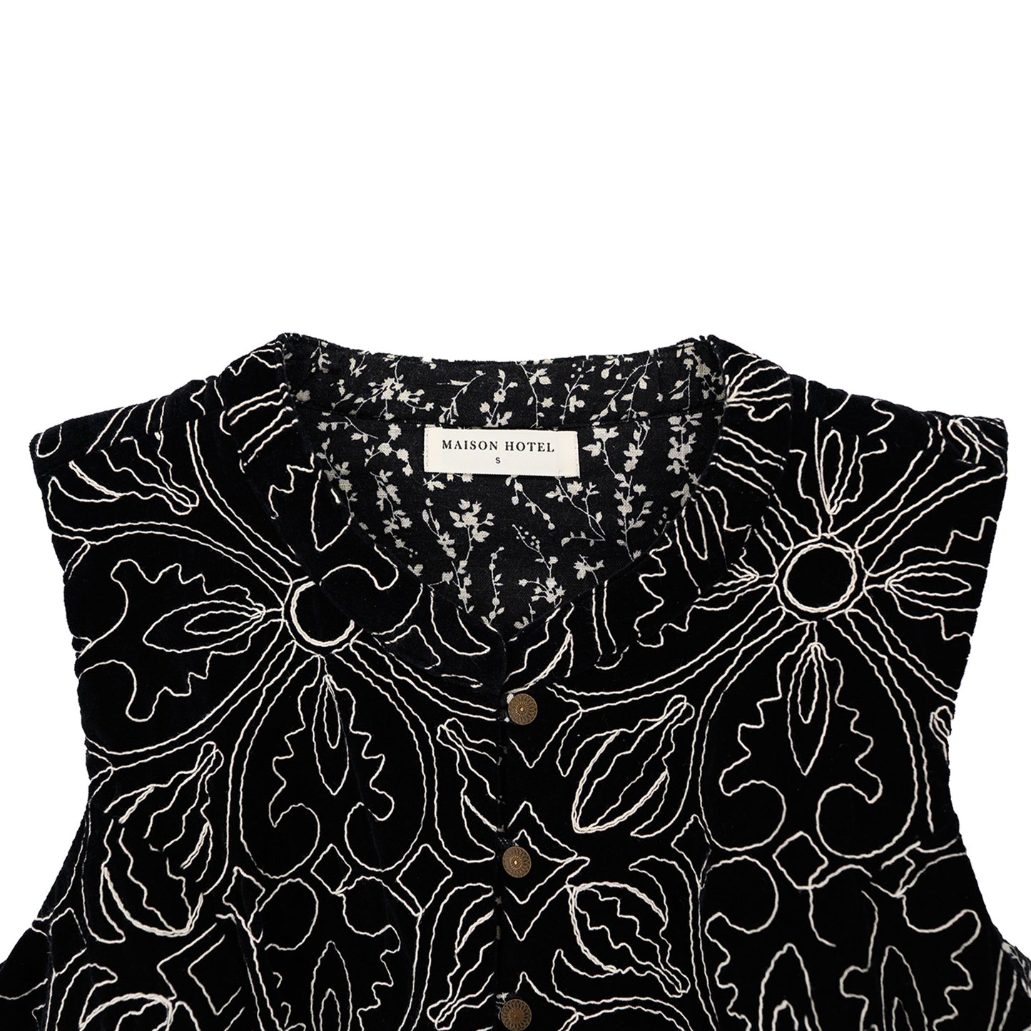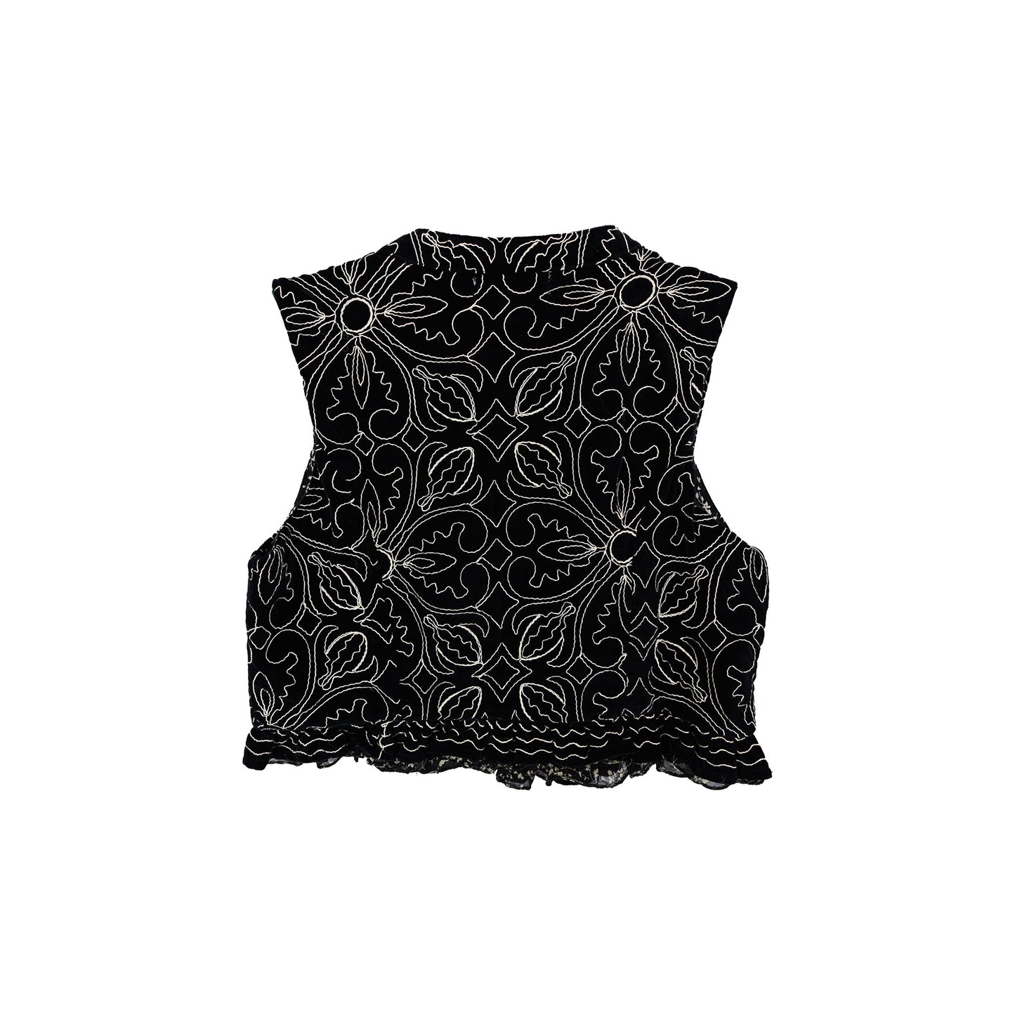 The Marceline Vest in Night Lilly is embroidered in golden metallic thread, cut into a vest that feels both folk and baroque. A nod to the folk undercurrents of the 70s, when embroidery and music blurred into one.