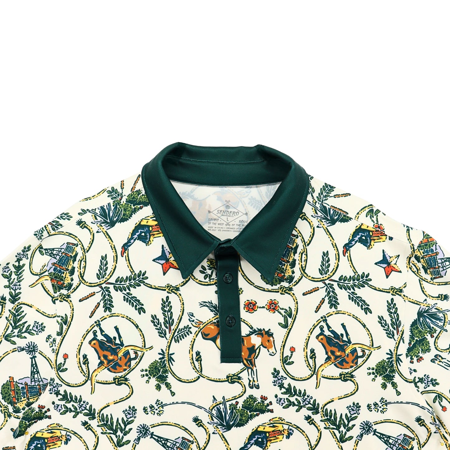 We didn't set out to re-invent the wheel on the performance polo, or become the next ex-tech apparel sensation out of Austin - but we did want to create a genuine casual (but ENTIRELY functional) masterpiece that combines all the charm of the country club with the rugged Spirit of the West. Plenty of stretch for when you're trying to launch one into orbit or chowing down on your midday BBQ run. The High Noon boasts an athletic, breezy fit that's as comfortable as a well-worn saddle! Although, it probably weighs about 30 pounds less...High Mobility Stretch 91% Polyester / 9% Spandex, Water Wicking, Quick Dry Fabric. Athletic But Casual Fit.