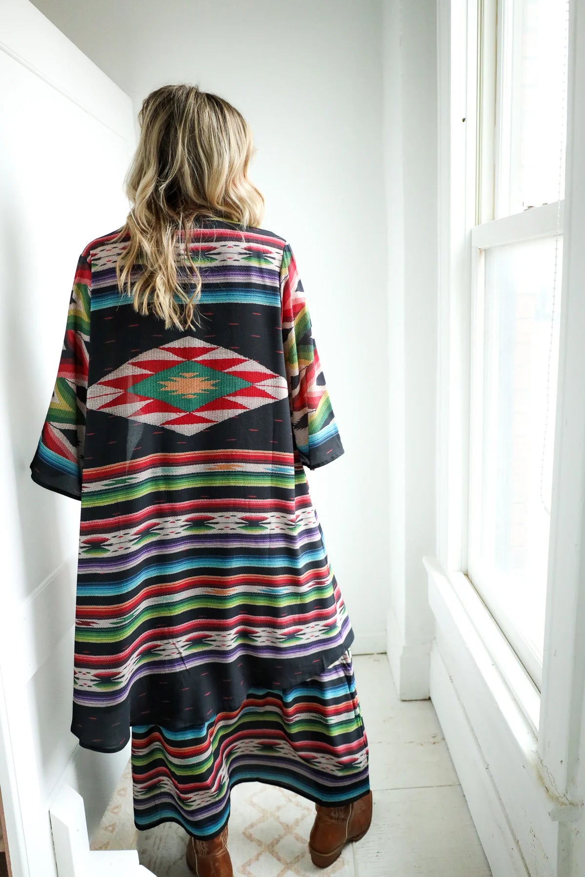 Wrap yourself in the vibrant charm of the Tasha Polizzi Whitley Duster! This featherlight serape kimono adds a pop of color and playful flair to any outfit. This piece is perfect for instantly turning an everyday look into something fabulous. Your new favorite layering piece is here!