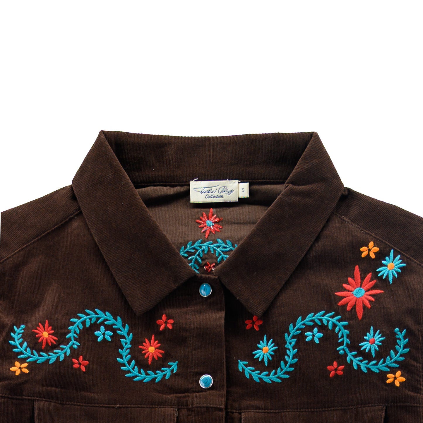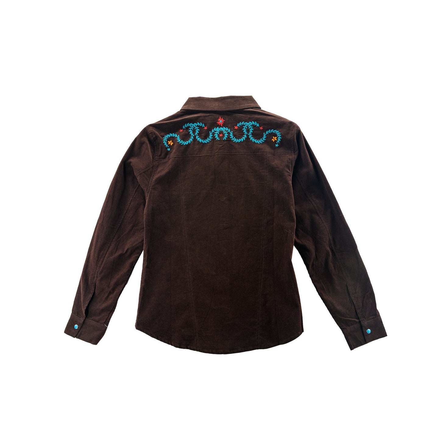 Ready to wear Western artistry like never before? The Cordelia Shirt pairs chocolate corduroy with turquoise embroidery, sculpted yokes, and snap buttons for a look that’s elegant, unexpected, and full of character.
