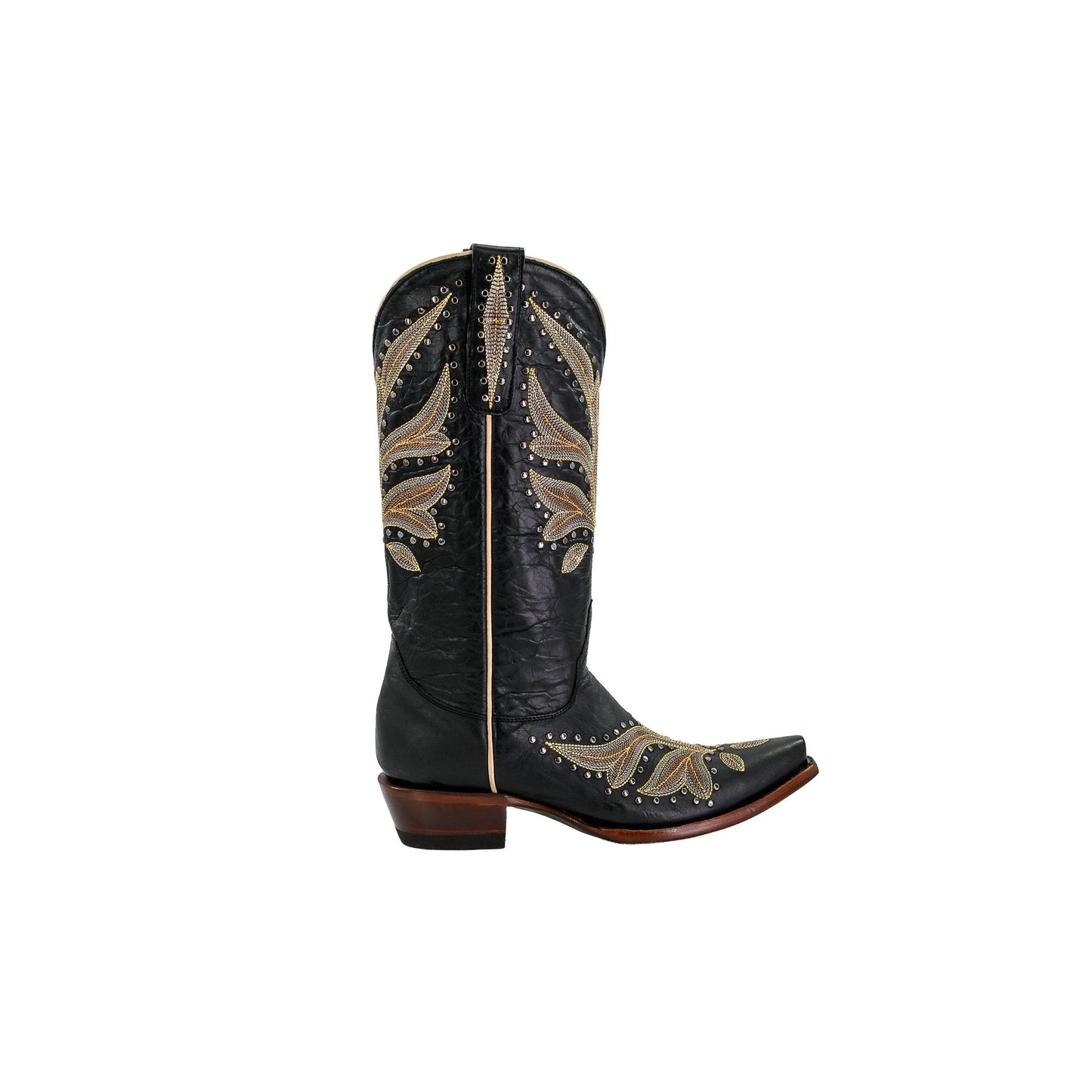 Made for those who love standout western style, the Zinnia boots feature intricate metallic thread and gunmetal studs that pop against rich black genuine leather. Bold, polished, and undeniably western, they pair striking design with all-day comfort thanks to a smooth leather lining, soft leather insole, and leather outsole with a rubber heel cap.