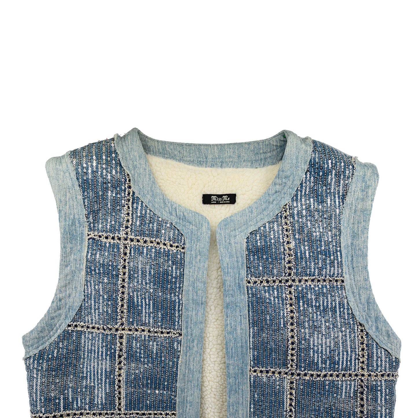 MISS ME Sequined Denim Vest with Sherpa Lining