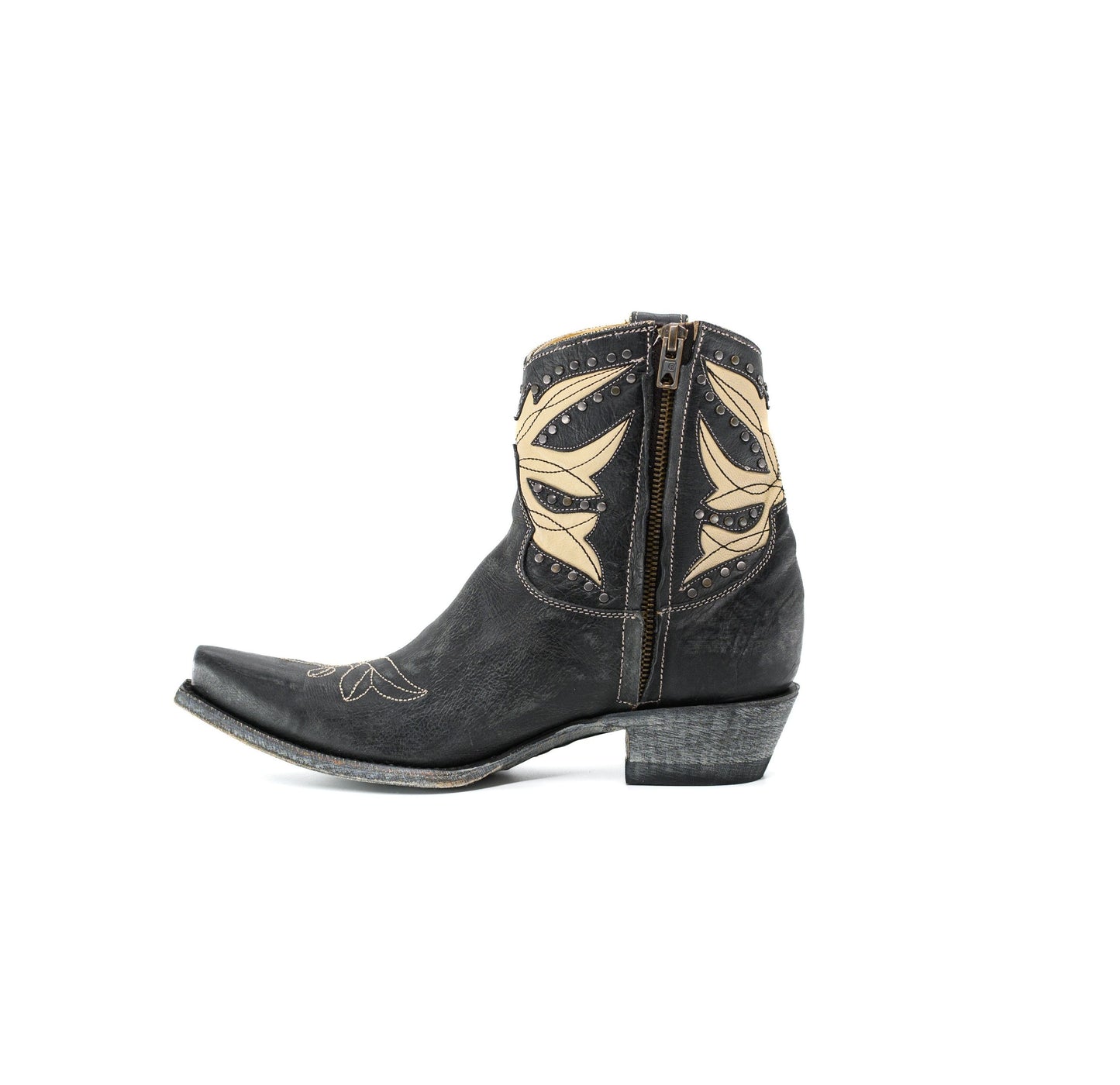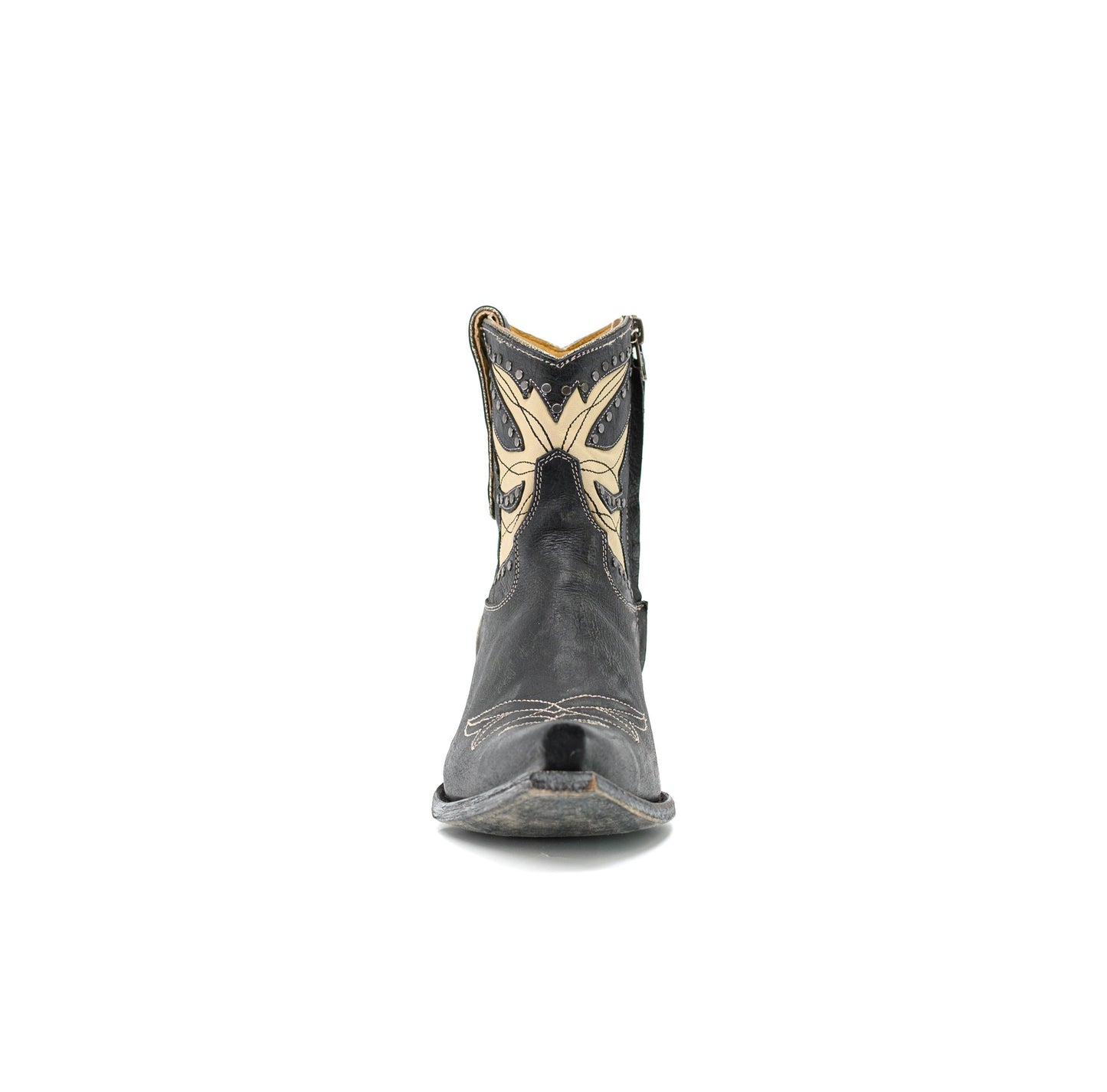 Amity Short boots are a modern take on the classic cowgirl boot. Crafted in distressed black and white leather, studded accented design along the shaft with precise western stitching. A pointed toe and traditional heel make them both stylish and comfortable for everyday wear