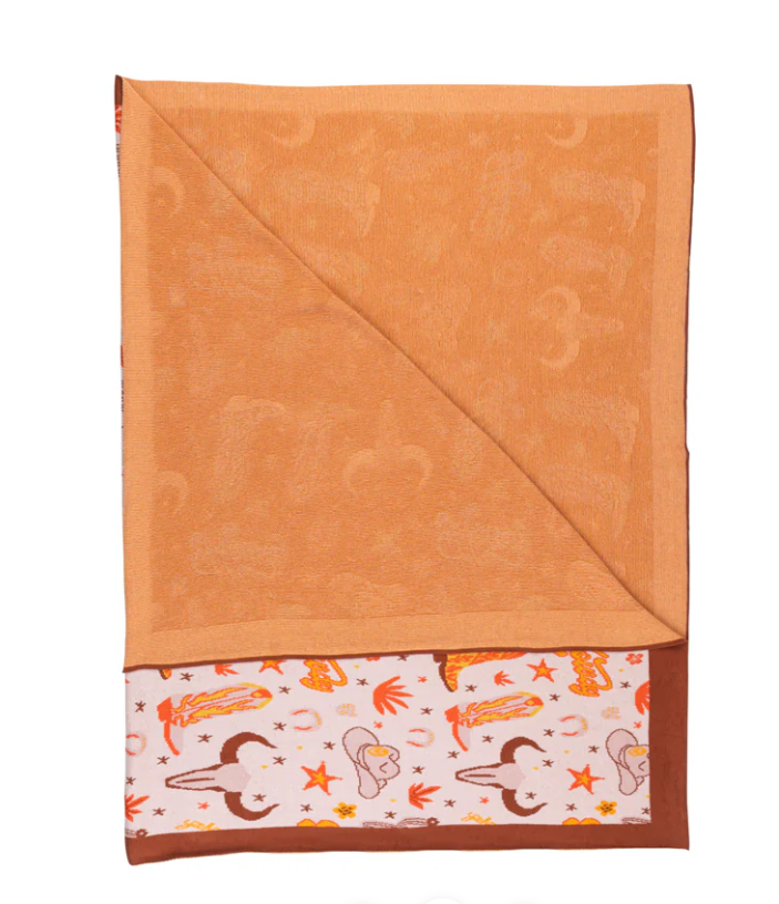 Add a playful pop of Western whimsy with this blush pink throw featuring retro-inspired cowgirl boots, cacti, and desert motifs. The rustic terracotta border and sweet starlit pattern create the perfect cozy accent for your free-spirited space.
